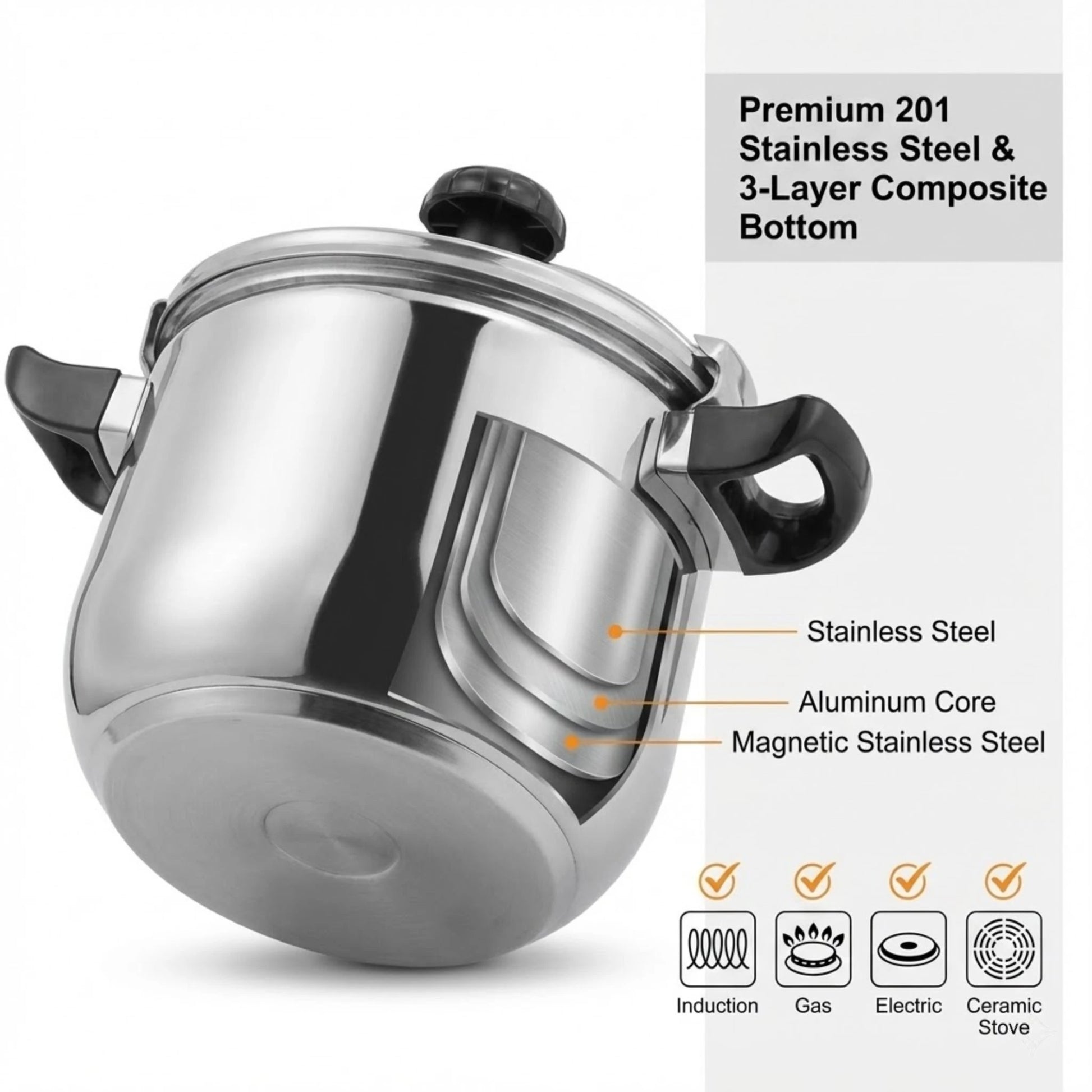 - 11.01 Qt capacity lets you cook for the whole family; crafted from high-grade 201 stainless steel with a polished finish for durability and easy cleaning; compatible with open flame, electric, ceramic, induction, and gas stoves.
